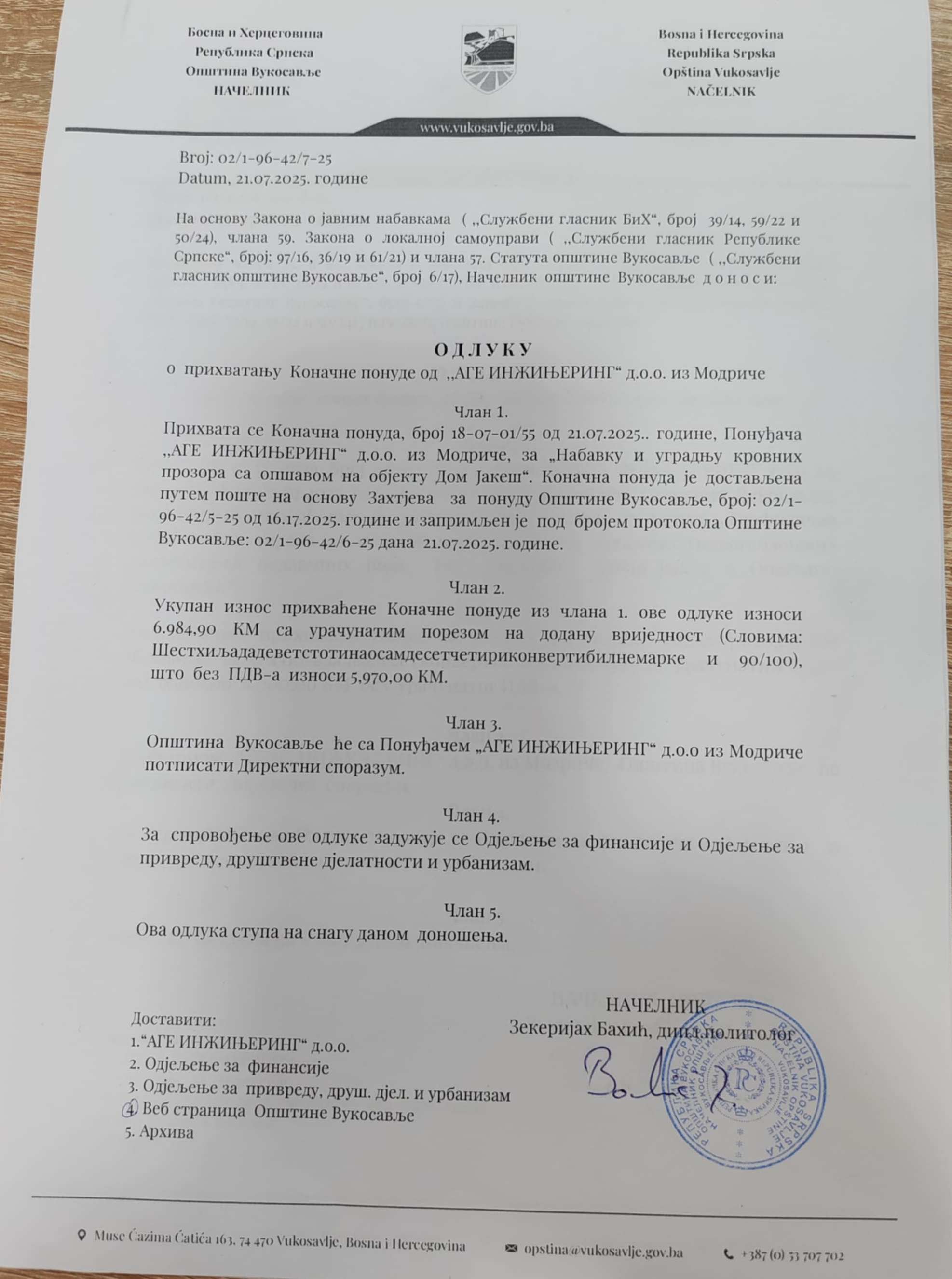 25.16.05.2025 o prihvatanju ponude od EUROCOMPANY doo iz Modriče