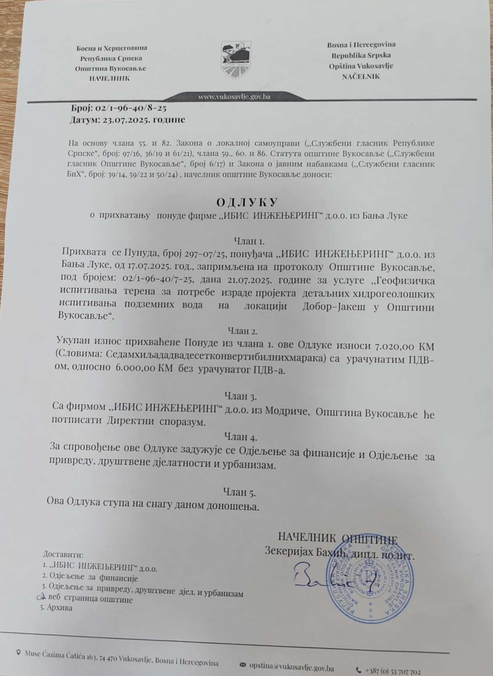 34. 23.07.2025. o prihvatanju ponude firme IBIS INŽINJERING d.o.o. iz Banja Luke